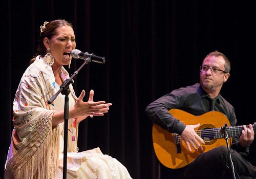 Marina Heredia en uno de los momentos de su actuación en Sevilla. Foto: Adam NewbyY, por eso, con enorme facilidad, se metió en el bolsillo al público que abarrotaba la Sala Joaquín Turina a fuerza de cante y más cante. Mostrando que tiene la misma facilidad para pasar del drama y a la comedia que para cambiarse de vestido. Haciendo ver que es capaz de mecerse en unas preciosas milongas cargadas de sensibilidad, incluidas en su nuevo disco ‘A mi tempo’. De romperse en unas contenidas malagueñas por fandangos del Albaicín. De imprimir la máxima gitanería por soleá. De soltar todas las riendas –micro incluido- para desvanecerse en el cuplé por bulerías. De retomar la fuerza y rasgarse por seguidillas. De crear e inventar notas nuevas en los pregones y las tonás. De ponerle pellizco a las bulerías por soleá. De sacar todo el eco de las cuevas en noche cerrada en unos emocionados y emocionantes ‘Morentangos’. De acordarse de Camarón por bulerías sin sonar camaronera. De, si cabe, ser más grande que la más grande en la mejor versión de ‘Se nos rompió el amor’ que se ha oído de la Jurado. De concluir por fandangos chocolateros, como si no hubiera un mañana. De demostrar que hay un cante para oír y para ver. Sin ojana.